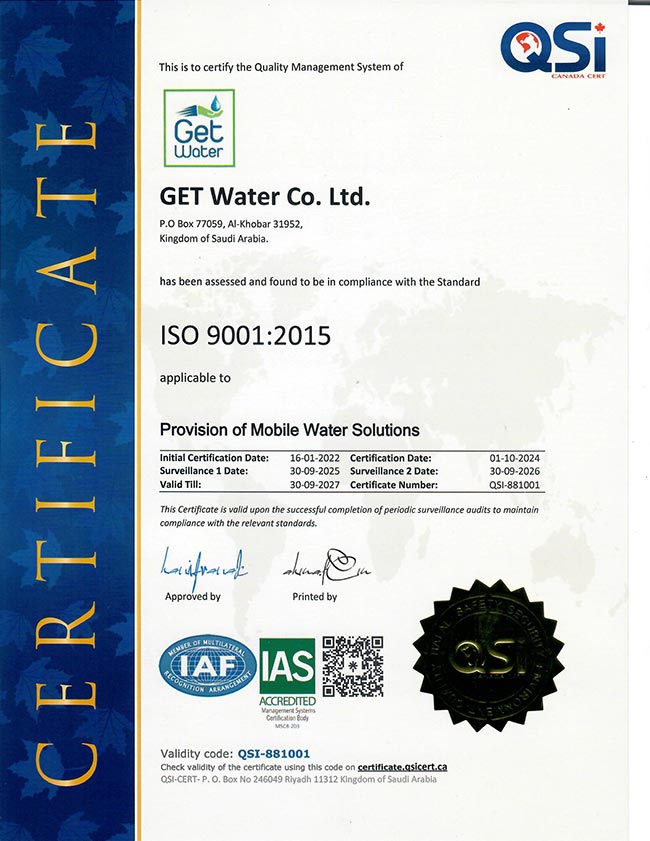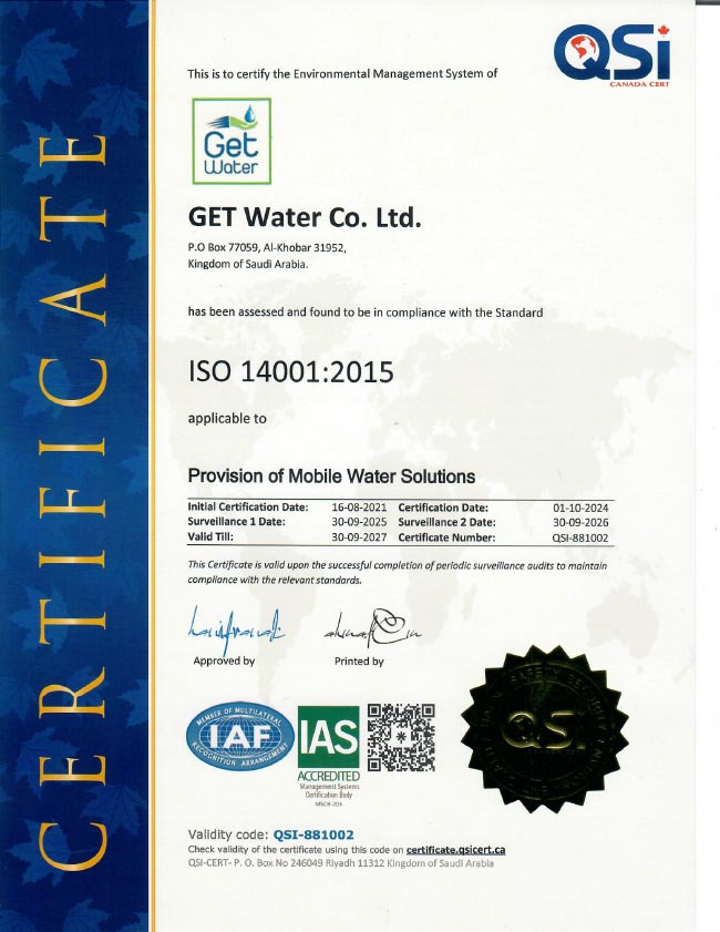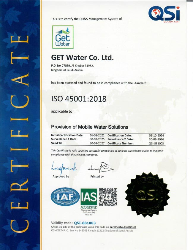 GET Water Co. Ltd. is a leading mobile water solutions provider company in the Kingdom of Saudi Arabia. The company aims to provide high quality services through a proactive approach and is strongly committed to the following: